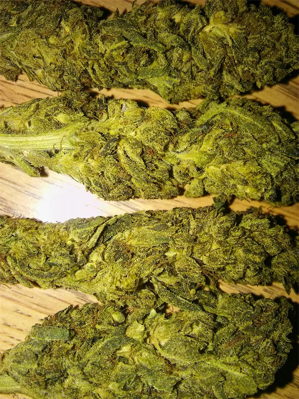 Trainwreck’s appearance is characterized by vibrant, long, and densely packed green buds. These nugs are often intertwined with fiery orange pistils and coated in a layer of glistening trichomes, giving them a frosty, almost crystalline look.